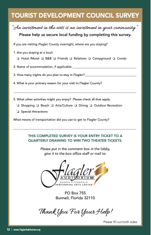 THIS COMPLETED SURVEY IS YOUR ENTRY TICKET TO A QUARTERLY DRAWING TO WIN TWO THEATER TICKETS.