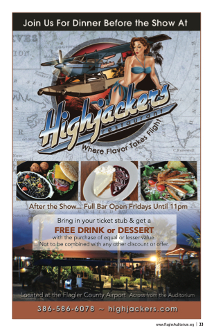 Bring in your ticket stub & get a FREE DRINK or DESSERT with the purchase of equal or lesser value. Not to be combined with any other discount or offer. www.FlaglerAuditorium.org | 33