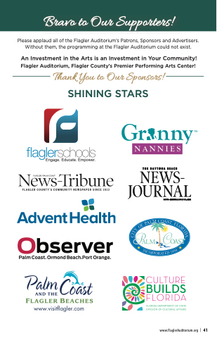Please applaud all of the Flagler Auditorium’s Patrons, Sponsors and Advertisers. Without them, the programming at the Flagler Auditorium could not exist.