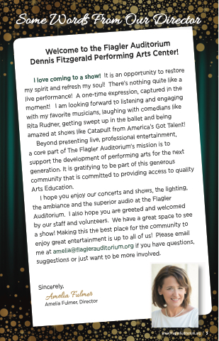 I hope you enjoy our concerts and shows, the lighting, the ambiance and the superior audio at the Flagler Auditorium. Ialsohopeyouaregreetedandwelcomed by our staff and volunteers. We have a great space to see a show! Making this the best place for the community to enjoy great entertainment is up to all of us! Please email me at amelia@flaglerauditorium.org if you have questions, suggestions or just want to be more involved.