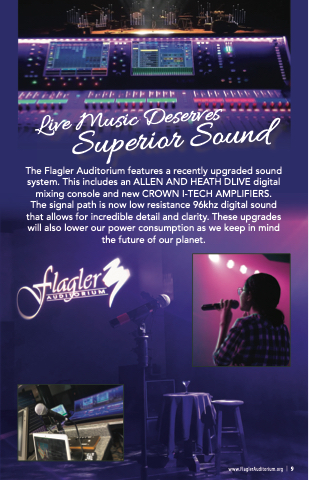 The Flagler Auditorium features a recently upgraded sound system. This includes an ALLEN AND HEATH DLIVE digital mixing console and new CROWN I-TECH AMPLIFIERS. The signal path is now low resistance 96khz digital sound that allows for incredible detail and clarity. These upgrades will also lower our power consumption as we keep in mind the future of our planet.